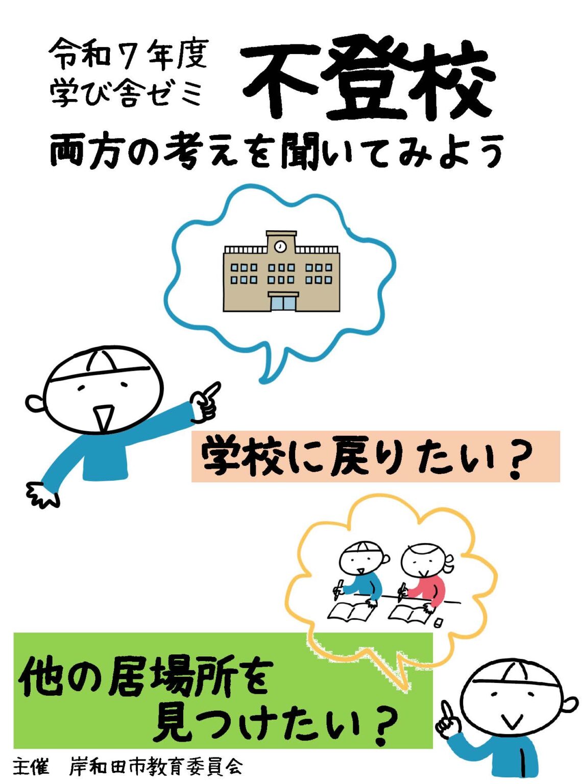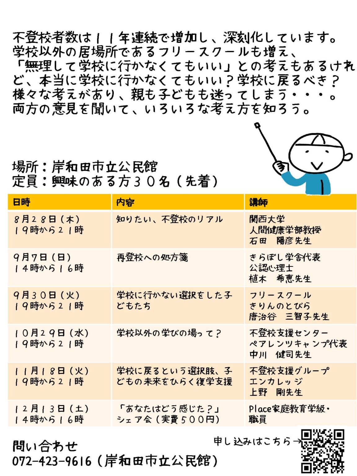 岸和田市教育委員会が主催する「令和7年度学び舎ゼミ」では、全6回シリーズで不登校に携わっている専門家の意見を聞くことができます。